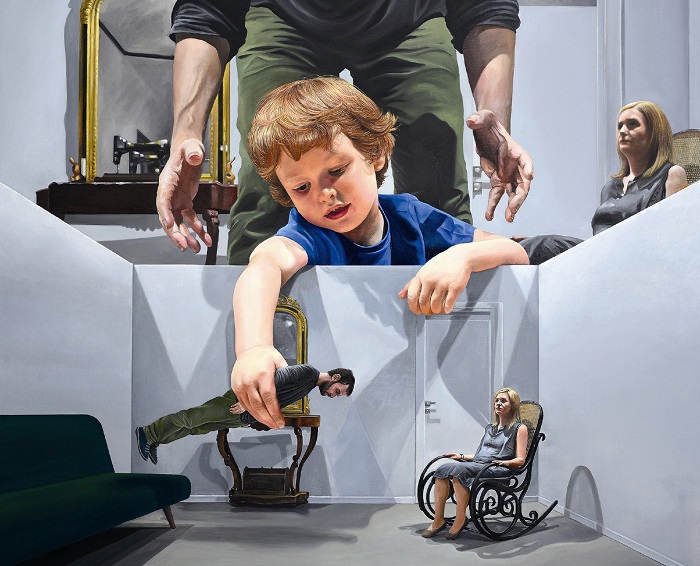 Σε εντελώς άλλη κατεύθυνση κινείται ζωγραφικά αλλά και ιδιοσυγκρασιακά η έκθεση «Tάνγκραμ» του Δημήτρη Αναστασίου (γκαλερί Citronne, Κολωνάκι, έως 28.1.2023) –όπου τάνγκραμ είναι ένα είδος κινέζικου παζλ με επτά πλακίδια που μπορεί να συνδυαστούν σε πολλές παραλλαγές, αποτελώντας «το συντομότερο ψυχολογικό τεστ στον κόσμο». Η ίδια η λέξη δηλαδή προκαταβάλλει τον θεατή για την εναλλαξιμότητα και τη ρευστότητα των συνθέσεων του Αναστασίου, η οποία δίνει τη δυνατότητα στον καθένα να αναγνώσει τα έργα, να τα αποδομήσει ή να τα ερμηνεύσει με όποια σειρά-αφηγηματική γραμμή επιθυμεί. Στο δικό του αναπαραστατικό, αυτοπαρατηρητικό και συγχρόνως αυτοϋπονομευόμενο διαρκώς σύμπαν (δες λ.χ. τις «Τέσσερις εποχές», στα έργα του Αναστασίου κυριαρχεί η μορφή του ίδιου του ζωγράφου), βλέπουμε για μία ακόμα φορά με λαμπρή ευφυΐα να συνδυάζονται ρεαλιστικά οι κοινωνιολογικές παρατηρήσεις (λ.χ. η ανθρώπινη μοναξιά στη νησίδα της λεωφόρου στο τάνγκραμ «Νησιά» ή στο «Γράμμα») με τα πιο ετερόκλητα λογοτεχνικά και φιλοσοφικά αναγνώσματα, μ’ έναν τρόπο τόσο φυσικό και συνάμα παιγνιώδη, που η μάλλον σουρεαλιστική συνύπαρξή τους καθίσταται αυτόχρημα σχεδόν αυτονόητη. Η θητεία του Αναστασίου στα κόμικ (το graphic novel Α=-Α, Καλειδοσκόπιο, 2018) τον κάνει να δημιουργεί διαρκώς ιστορίες, μόνο που οι δικές του παράδοξες αφηγήσεις παραμένουν αινιγματικές και πάντοτε ανοιχτές σε πολλαπλές ερμηνείες. Στο εκπληκτικό «Κουκλόσπιτο», ένα πυκνό σχόλιο-παζλ από 5 έργα πάνω στις ενδοοικογενειακές σχέσεις, ο πατέρας γίνεται μαριονέτα στα χέρια του γιου, τον οποίο με τη σειρά του κρατάει ο πατέρας του, υποδηλώνοντας μεταξύ άλλων ότι ο πατέρας οφείλει εξίσου τη γέννησή του στον γιο του (ως ρόλος και σχέση), όπως ο γιος οφείλει τη γέννησή του στον πατέρα. Στην «Ανθρώπινη κατάσταση ΙΙ (Ο κρατών)», στον ζωγράφο υποδεικνύει την ενδεδειγμένη πορεία προς τα εμπρός ο σκαρφαλωμένος στην πλάτη εαυτός του, πράγμα που σ’ εμένα θύμισε το «δίκωλο» του Γιάννη Κιουρτσάκη από το Σαν Μυθιστόρημα: το καρναβαλικό δρώμενο του Πόντου όπου κάποιος κουβαλάει στην πλάτη του έναν άλλο, όπου ο Άλλος είναι συστατικό στοιχείο του εαυτού του (στον Κιουρτσάκη ο ζωντανός αδελφός μεταφέρει στη ράχη του το σώμα του νεκρού αδελφού του), μόνο που εδώ πρόκειται για το ίδιο πρόσωπο. Η αυταναφορικότητα του ζωγράφου υποδηλώνει κατάργηση της πολυφωνίας του εαυτού ή θέαση του ίδιου του εαυτού ως άλλου; Η ευφάνταστη παραπεμπτικότητα και οι πλούσιοι συμβολισμοί των έργων του Αναστασίου είναι λόγος σοβαρός για να δείτε την έκθεσή του. Προλαβαίνετε ακόμα!