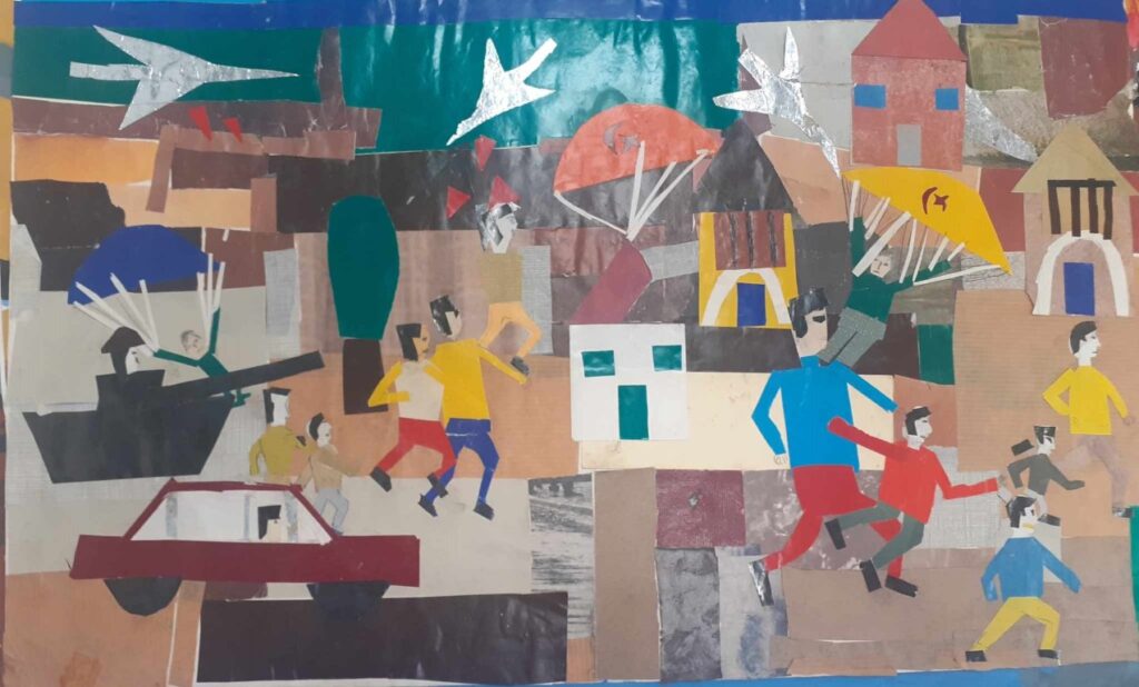 Η σκηνογραφία στην έκθεσή μας –μεταλλικά βαρέλια και σακιά αναπαριστούν ένα οδόφραγμα στην έκθεση– φέρνει την ωμή πραγματικότητα που γνωρίζουμε από τις φωτογραφίες στο παρόν μας και στον χώρο μας.