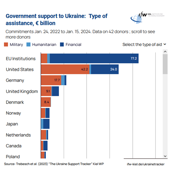 Οι συνολικοί πόροι που έχουν δοθεί στην Ουκρανία από 24 Ιανουαρίου 2022 έως 15 Ιανουαρίου 2024 ανέρχονται σε 252,4 δις ευρώ και κατανέμονται ως ακολούθως : Ευρωπαϊκοί θεσμοί και Ευρωπαϊκές χώρες 144,1 δις ευρώ. ΗΠΑ 67,7 δις ευρώ[19]. Υπόλοιπες χώρες 40,6 δις ευρώ. Σημειώνουμε ότι η Ελλάδα έχει παραχωρήσει το 0,095% του ΑΕΠ σε στρατιωτικό εξοπλισμό στην Ουκρανία από τον Ιανουάριο του 2023 έως τον Ιανουάριο του 2024, που αντιστοιχεί σε πάνω από 180 εκατ. ευρώ για τον πόλεμο με τη Ρωσία, σύμφωνα με τον Ukraine Support Tracker του πανεπιστημίου του Κιέλου.